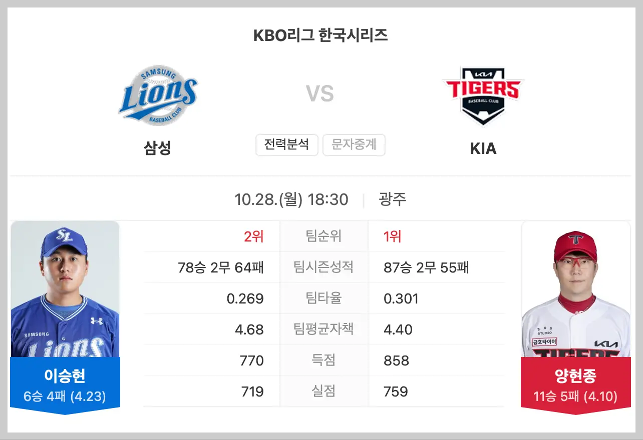 - 선발투수: 삼성 이승현선수, 기아 양현종 선수